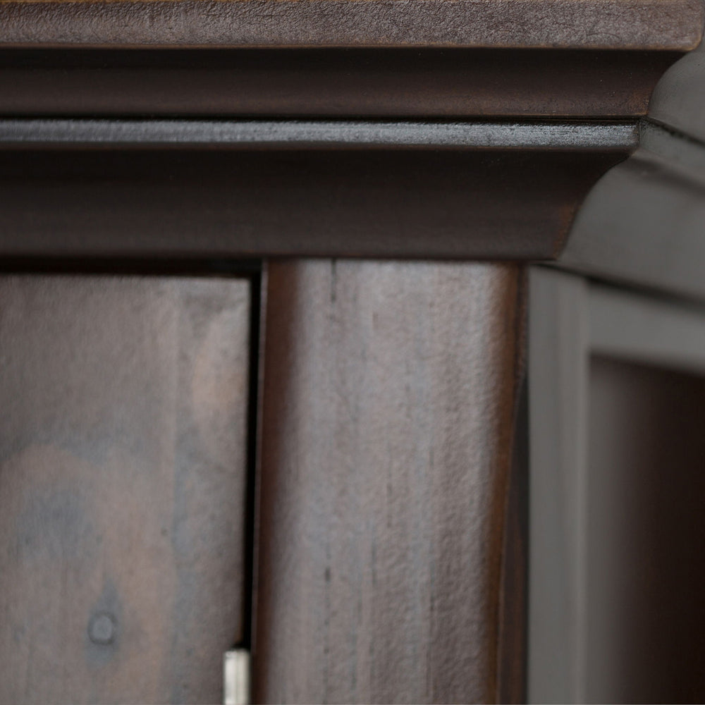 Features two (2) bottom drawers, two (2) side cabinets with tempered glass doors with one (1) adjustable shelf each