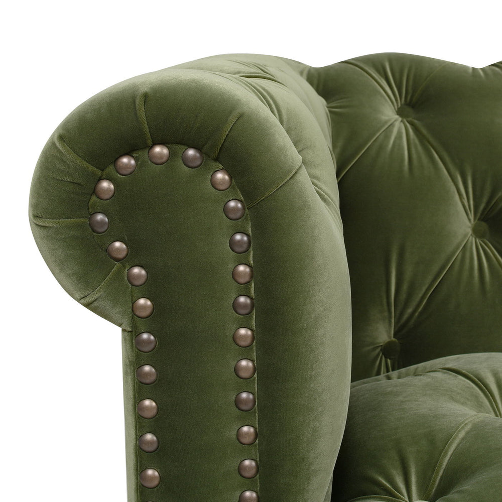 Elegant Accents: The sofa boasts hand-applied iron nailhead accents with an antique brass finish, along with button tufting along the arms, seat, and seat back for a classic touch.