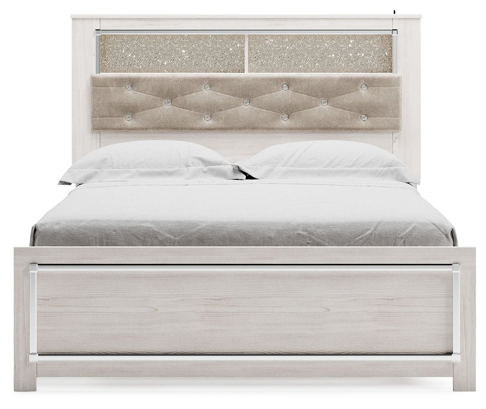 The epitome of fashion-forward design, this queen upholstered bookcase bed is a beautiful blend of comfort and luxury. Shiny chrome-tone accents, a pearlized finish and button-tufted upholstery bring a glam touch to the richly rustic appearance. Remote-controlled LED lighting adds style and modern convenience to your restful retreat.