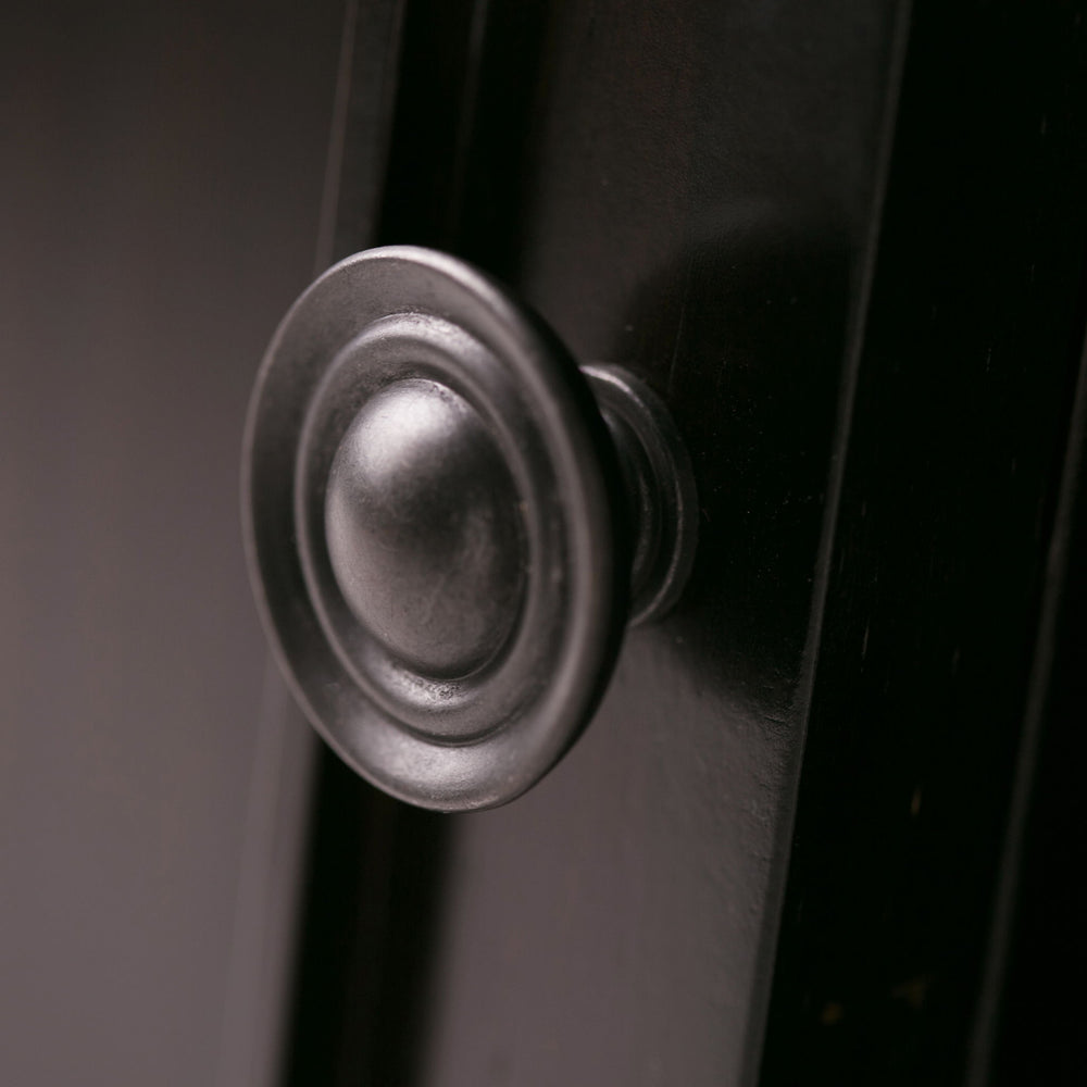 Transitional design includes tapered legs, panel framed door fronts, and antique bronze round decorative knobs