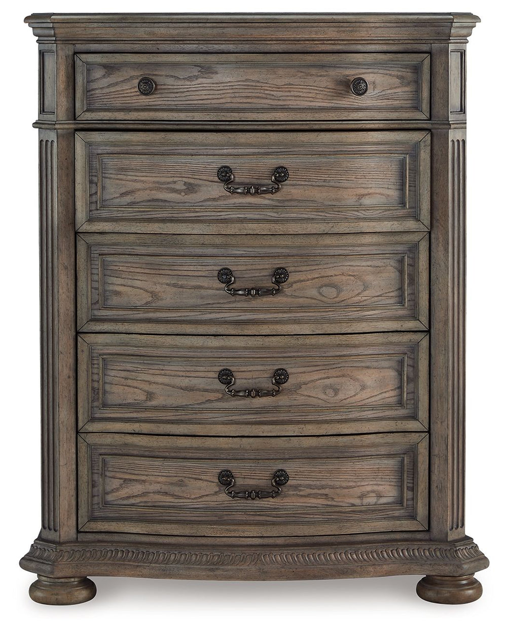 Merging traditional elegance with modern comfort, this chest of drawers takes your bedroom retreat to the next level. Serpentine curves, ash swirl veneer inlays and a glazed antiqued-look finish radiate timeless sophistication. Drawers are packed with ample storage possibilities. Talk about stunning refinement.