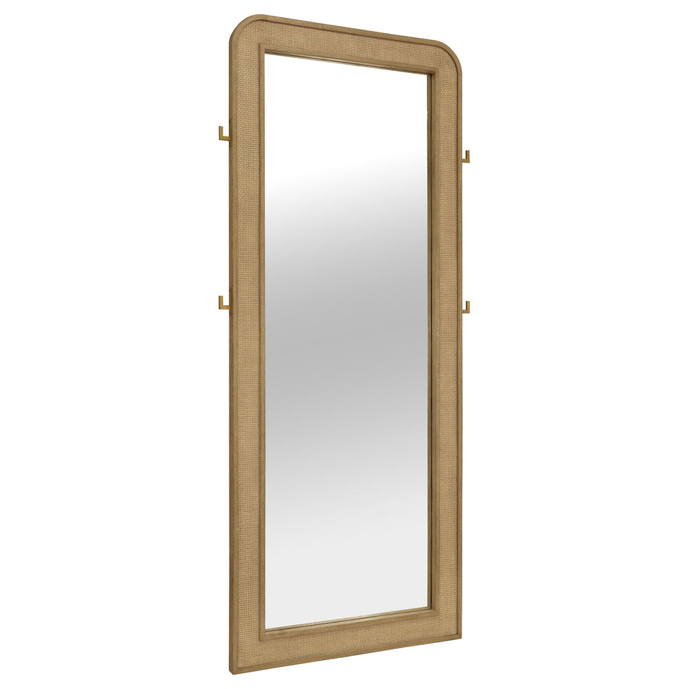 Elevate your bedroom or dressing area with this elegant full-length mirror, designed to bring both style and functionality to your space. The mirror features a sleek, rounded-edge frame finished in a sophisticated, textured material that adds a touch of warmth and refinement. Integrated hooks on the sides provide convenient storage for accessories, making it a versatile addition to your decor. Whether you're checking your outfit from head to toe or simply adding a decorative element, this mirror enhances any room with its blend of practicality and chic design. Perfect for modern and transitional spaces, it's a must-have for creating a polished look in your home.