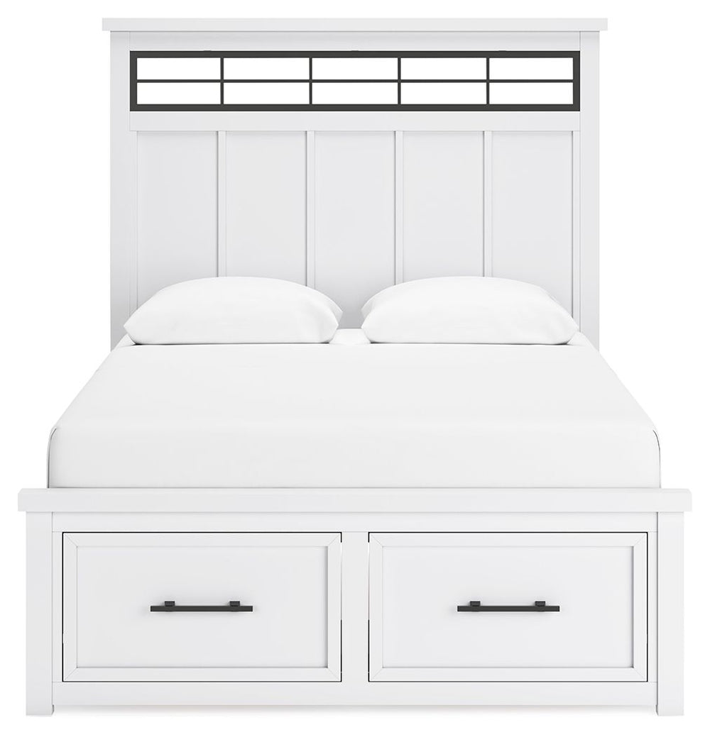 This panel storage bed delivers casual style with substance. An inset metal detail on the headboard displays a unique take on modern farmhouse design. The bed's sturdy silhouette, classic finish and black pulls exude a comfortably cozy vibe in your soothing sanctuary. Storage drawers are spacious enough for all your essentials.