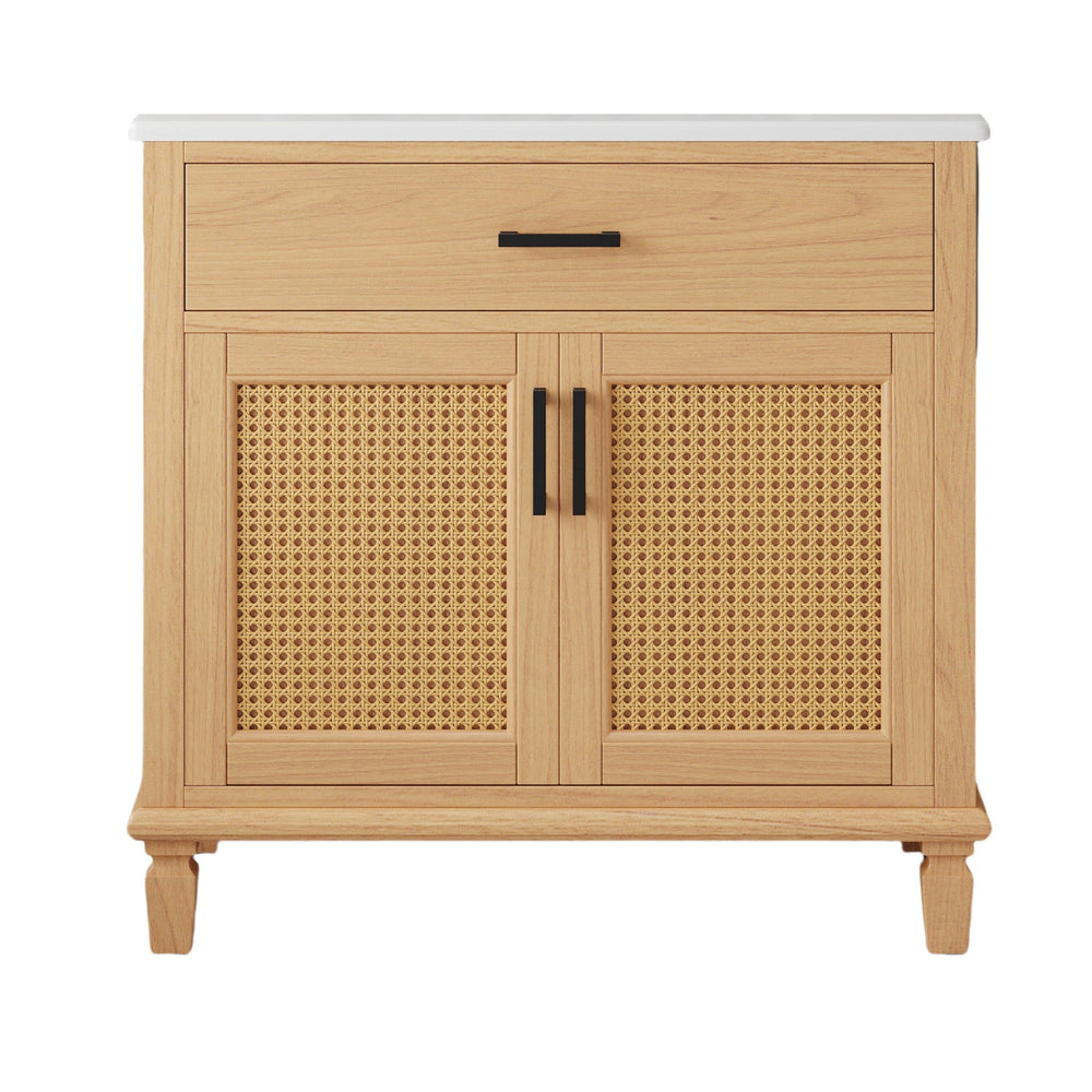 Glossy Finish and Easy Maintenance: The high-gloss countertop resists stains and is simple to clean, while the open weave of the rattan promotes airflow to reduce moisture buildup.