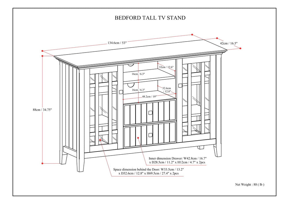 Bedford - Tall TV Media Stand - Dark Tobacco Brown 16.5"W x 53.0"D x 34.7"H - 86.0 lb