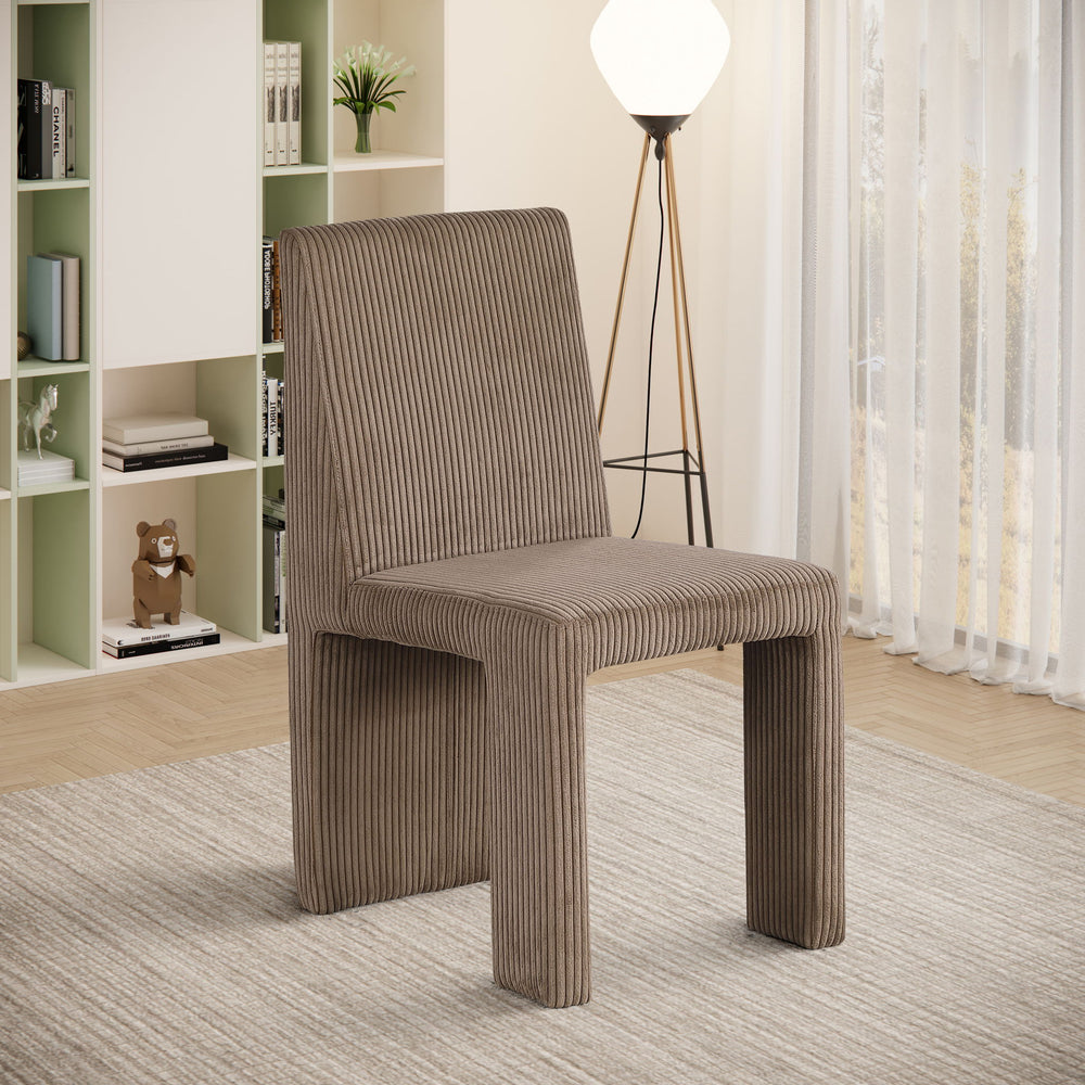 Unveil the elegance of the Benson dining chair, upholstered in soft microsuede corduroy fabric. Featuring an Art Deco design and a robust iron inner frame, this chair offers a perfect mix of luxury and resilience. The soft microsuede corduroy fabric and distinctive design make it an eye-catching addition to any dining area, ideal for enhancing both style and conversation.
