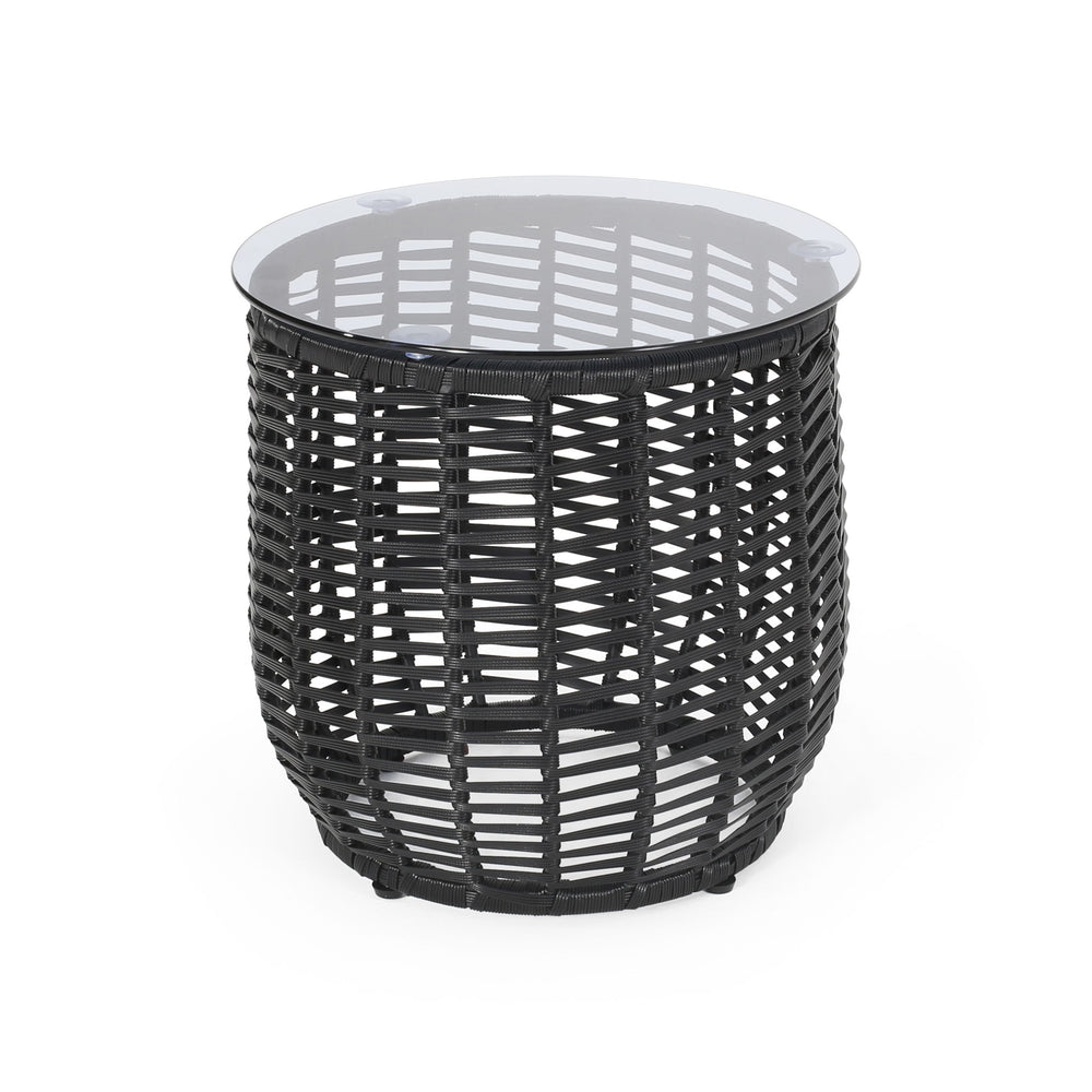 Arias - Boho Side Table With Tempered Glass Top And Rattan Wrap - Black 15.5"W x 15.5"D x 15.5"H - 9.04 lb
