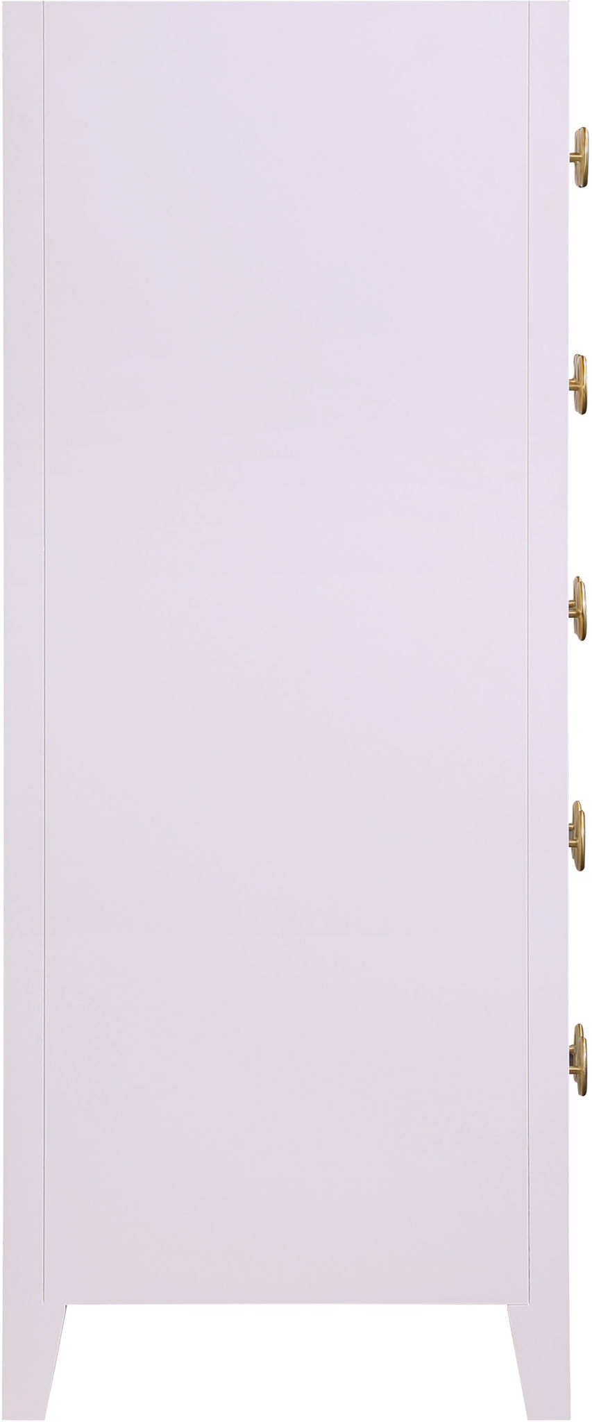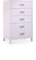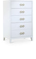 Bring unique elegance to your bedroom with this Bowtie chest from Meridian Furniture. This chest features five drawers, providing you with plenty of storage space for clothes, linens, or miscellaneous objects. Its light color adds a touch of femininity to your living space, and its brushed bow tie handles complement your existing decor. Its flat top is perfect for placing a lamp, framed picture, books, bric-a-brac, and more.