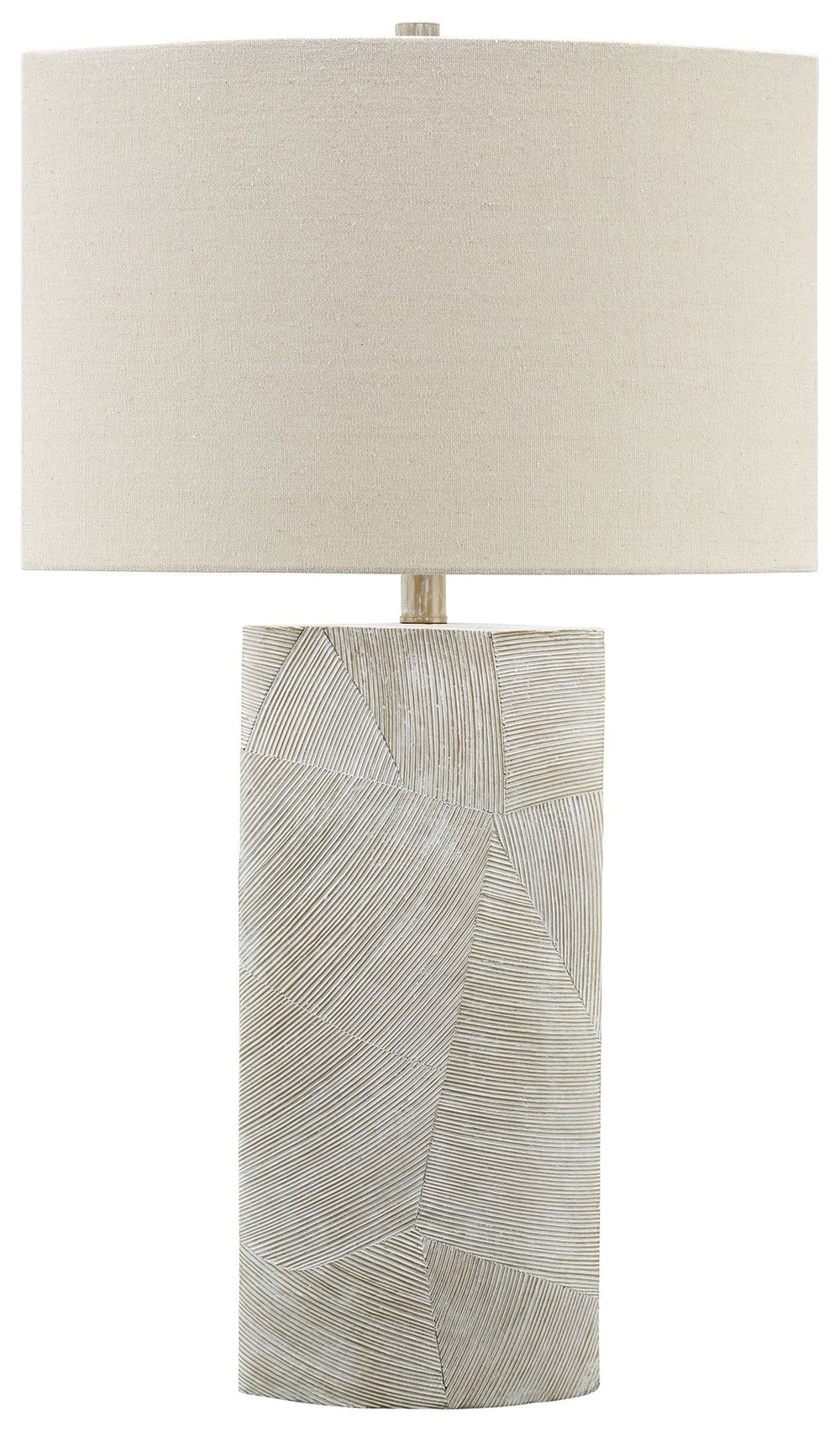 The rustic natural beauty of this table lamp makes it perfect for illuminating any room. Its brown and ivory resin base is complemented with a straight-side oval hardback shade. Low profile yet elegant, this lamp makes a gorgeous accent for contemporary spaces.