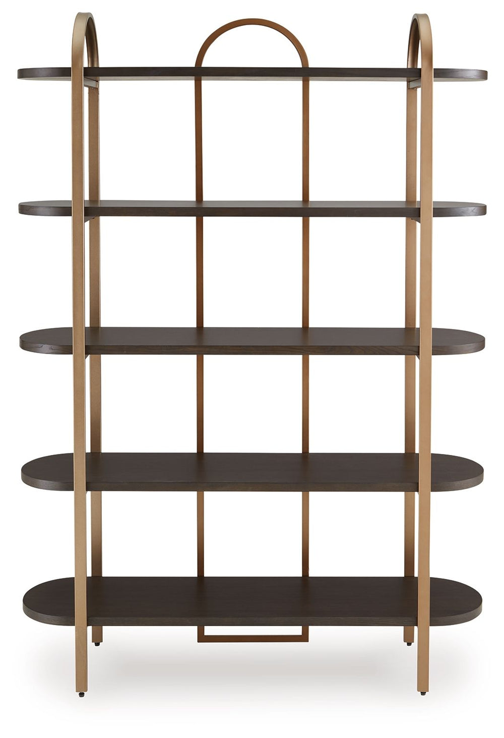 With its mixed-material look, this bookcase seamlessly fits into a wide range of modern settings. Five fixed display shelves in a dark brown finish are balanced by sleek antiqued goldtone metal supports. Offering storage and superior style for books or showcasing decor, this bookcase is a masterful way to stay organized.