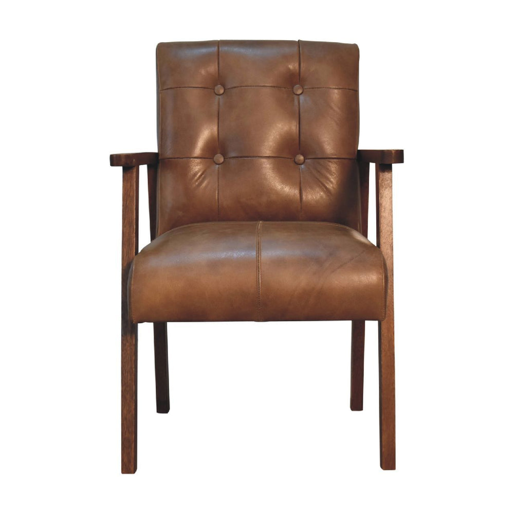 Brown Buffalo Leather Chair - This contemporary armchair is certain to add a sophisticated look & lavish living room or dining room experience. Made from quality buffalo hide leather it is upholstered in a brown colour with a plump seat, and a deep button back cushion. The legs and arms are constructed from 100% solid mango wood in a walnut finish. We hope you love it as much as we do.
