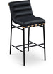 Kick back and relax with a drink in your hand with this Burke counter stool. Featuring soft black vegan leather upholstery and black vegan leather straps, this stool is cozy and stylish. Its matte metal frame provides sturdy support so you can enjoy this stool for years to come. A oak veneer metal dowel is tucked firmly in place beneath the front of the stool, providing extra support and added style.