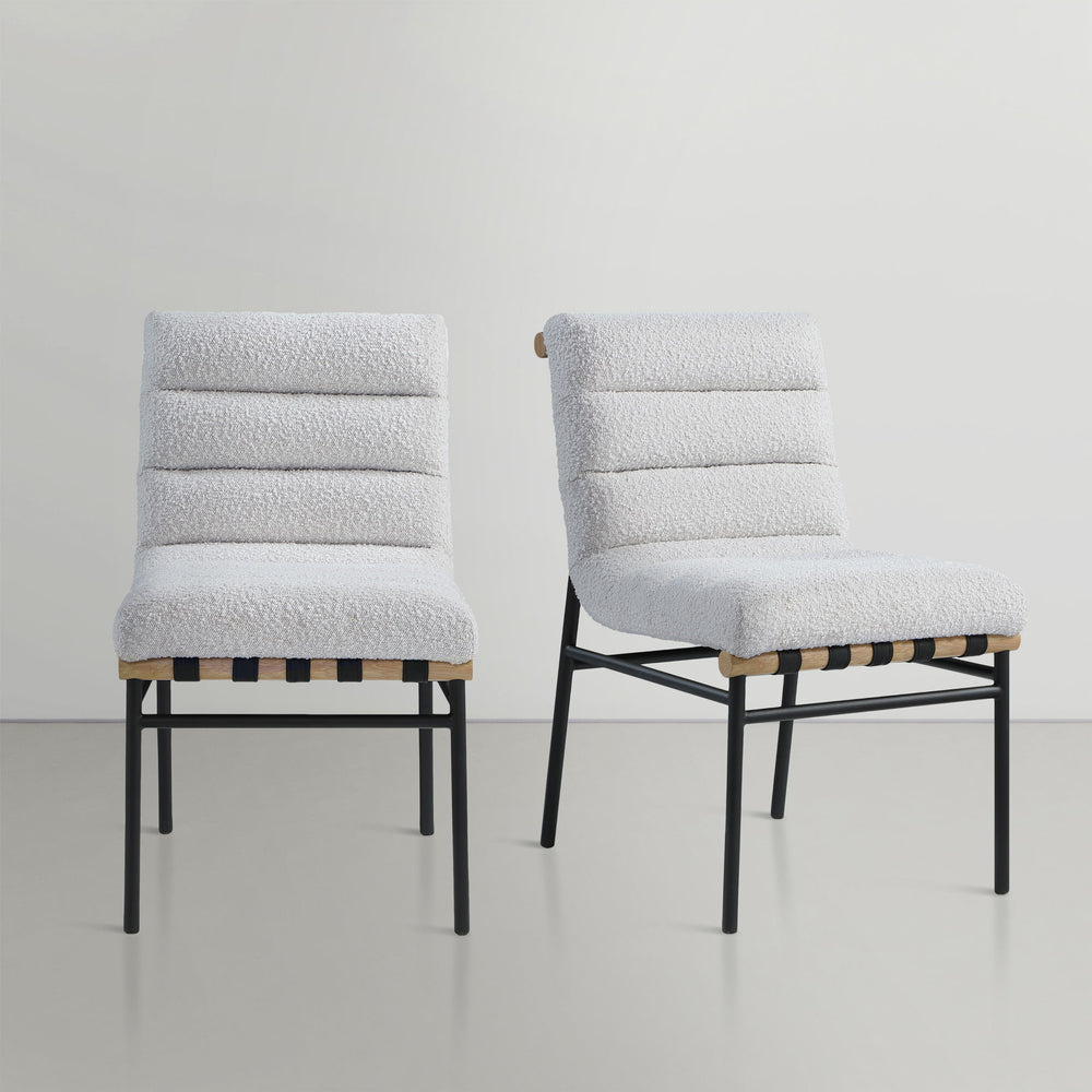 Keep guests sitting pretty for the entire meal with this Burke cream boucle fabricdining chair. This chair has rolled tufting for amazing support and durability and features an armless design that facilitates conversation between diners. A white oak veneer metal dowel on the back of the chair and under the seat lends additional interest to this modish dining chair option.
