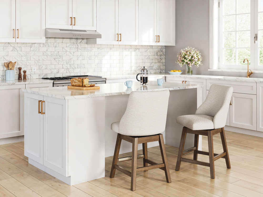 This counter height swivel bar stool sits comfortably at the intersection of modern lodge and farmhouse aesthetics. Your warm and welcoming disposition is reflected in its charming architectural elements and neutral textural fabric. Even with its poise, the stool remains practical. Its cushioned seat is covered in easy-clean Next-Gen Nuvella™ performance fabric, defining your dining room with reliable function and style.