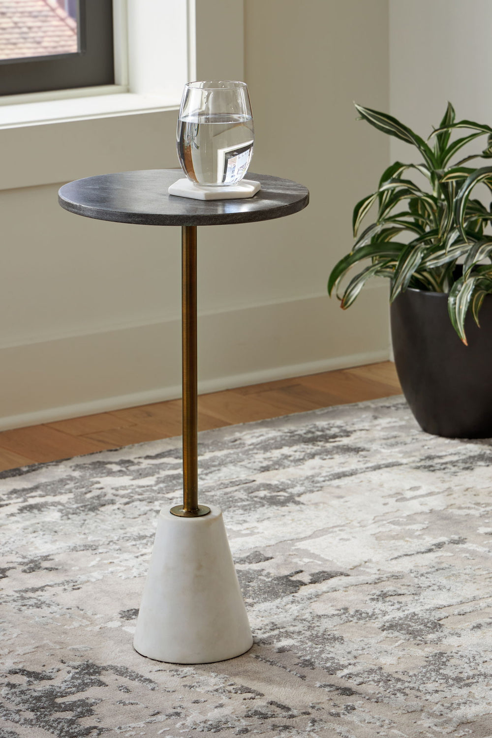 Marvel at the marbled mastery of this high-end accent table. Made of beautiful black and white marble, the round tabletop is supported by a sturdy goldtone pedestal on a white marble base. With a sleek, tapered profile, this space-saving table is striking from every angle.