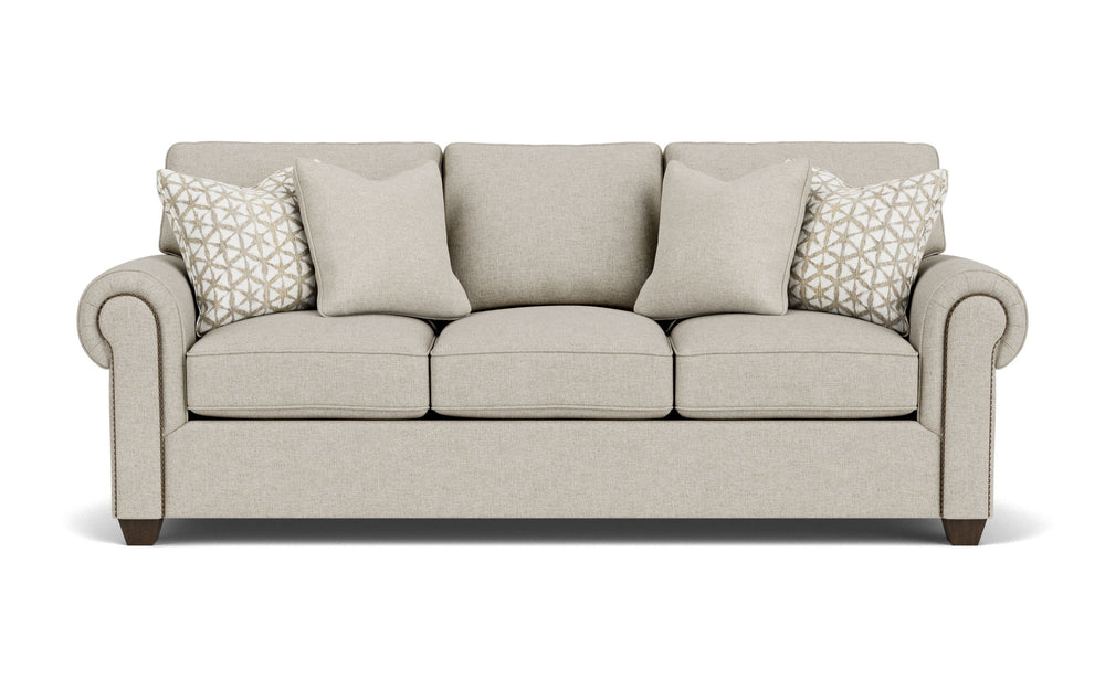A unique wrap-around padded armrest on Carson’s large-scale rolled arm is highlighted with pleats and welt cording. Optional nailhead trim tightly spaced lines the exposed arm fronts for a fun, visual effect. Relax into Carson’s overstuffed seat and back cushions after a long day and feel the stress melt away.