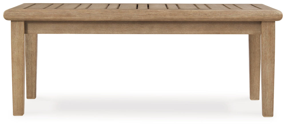 This outdoor coffee table effortlessly pairs natural beauty with must-have durability. Its eucalyptus wood construction withstands the elements while making a high-style impression. The perfect companion for relaxing on the porch or poolside, this table is a chic spot to rest alfresco essentials like drinks, books or a snack tray.