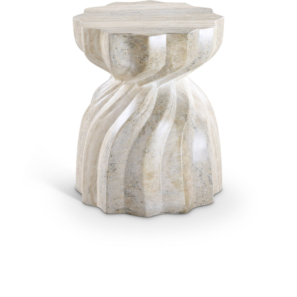 Sculptural elegance takes center stage in the Caserta travertine finish indoor/outdoor concrete end table. Wrapped in a bold marble finish, its fluid curves and intricate detailing bring an Art Deco-inspired touch to any space. Whether styled indoors or out, this piece makes an unforgettable statement.