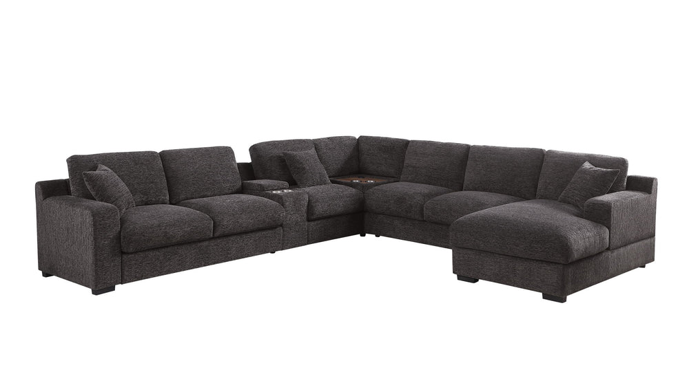 Experience unparalleled comfort and convenience with the Celine Sectional Sofa. Designed with a right-facing chaise, this sofa is perfect for lounging and relaxation. At the heart of its design is a center and corner console equipped with cupholders and charging ports, ensuring your devices stay charged while you unwind. This modular masterpiece includes an armless chair and loveseat, alongside a versatile console that can be assembled on either side to suit your space. The sofa comes with three plush throw pillows, enhancing its cozy appeal. Embrace both style and functionality with the Celine Sectional Sofa, a perfect addition to any modern living space.