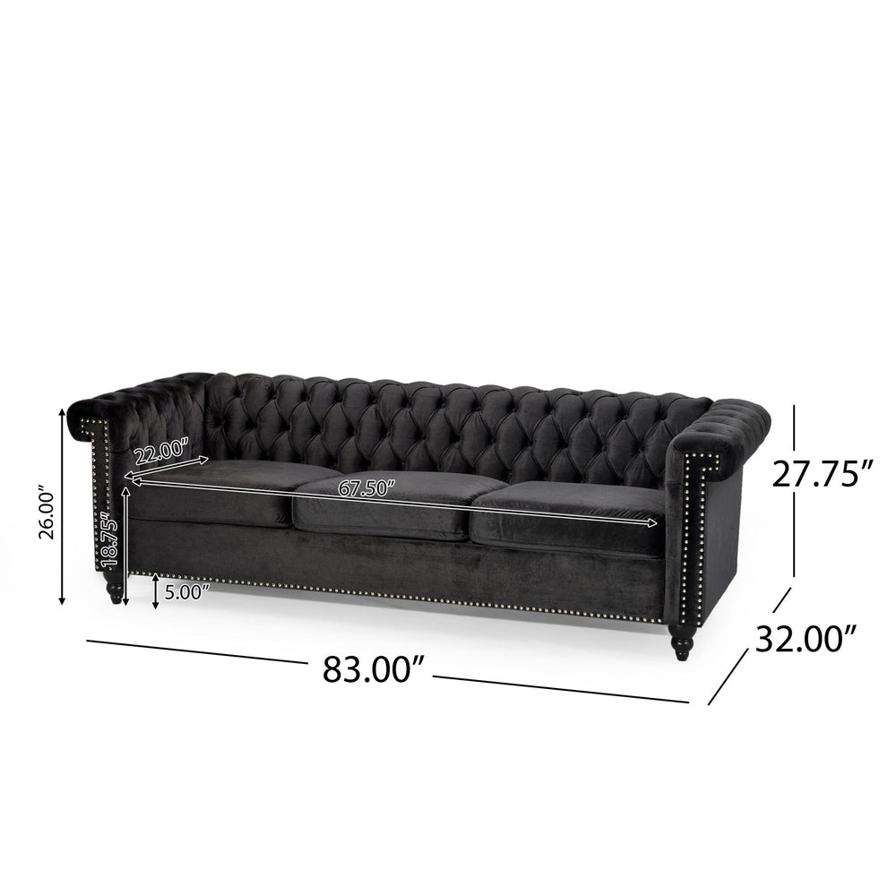 Chesterfield Style 3 Seater Sofa With Deep Button Tufting - Black 83.0"W x 32.0"D x 27.75"H - 90.39 lb