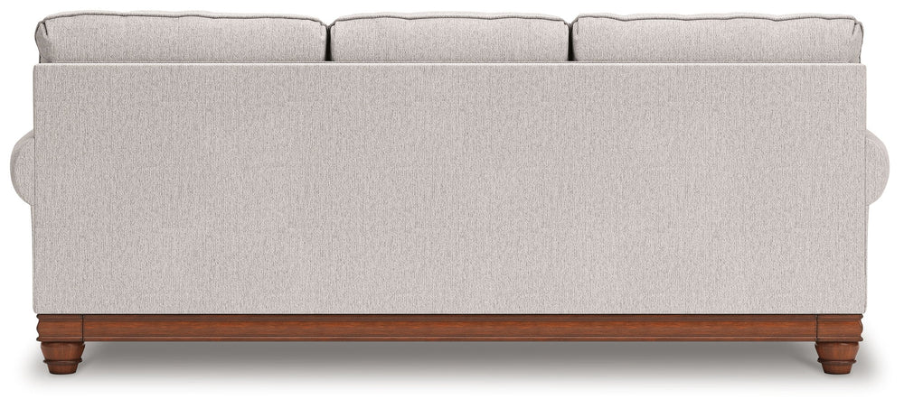 Fresh yet classic. That’s the beauty of this sofa. Dressy and also soft to the touch, its organic neutral-toned upholstery is sure to bring a transitional farmhouse aesthetic to your living space. Accent pillows in windowpane plaid and textured solid hues infuse a cozy and inviting farmhouse sensibility, while a full wraparound base and decorative turned legs complete the sofa's timeless look. It's the perfect place to unwind with your besties after a long day.