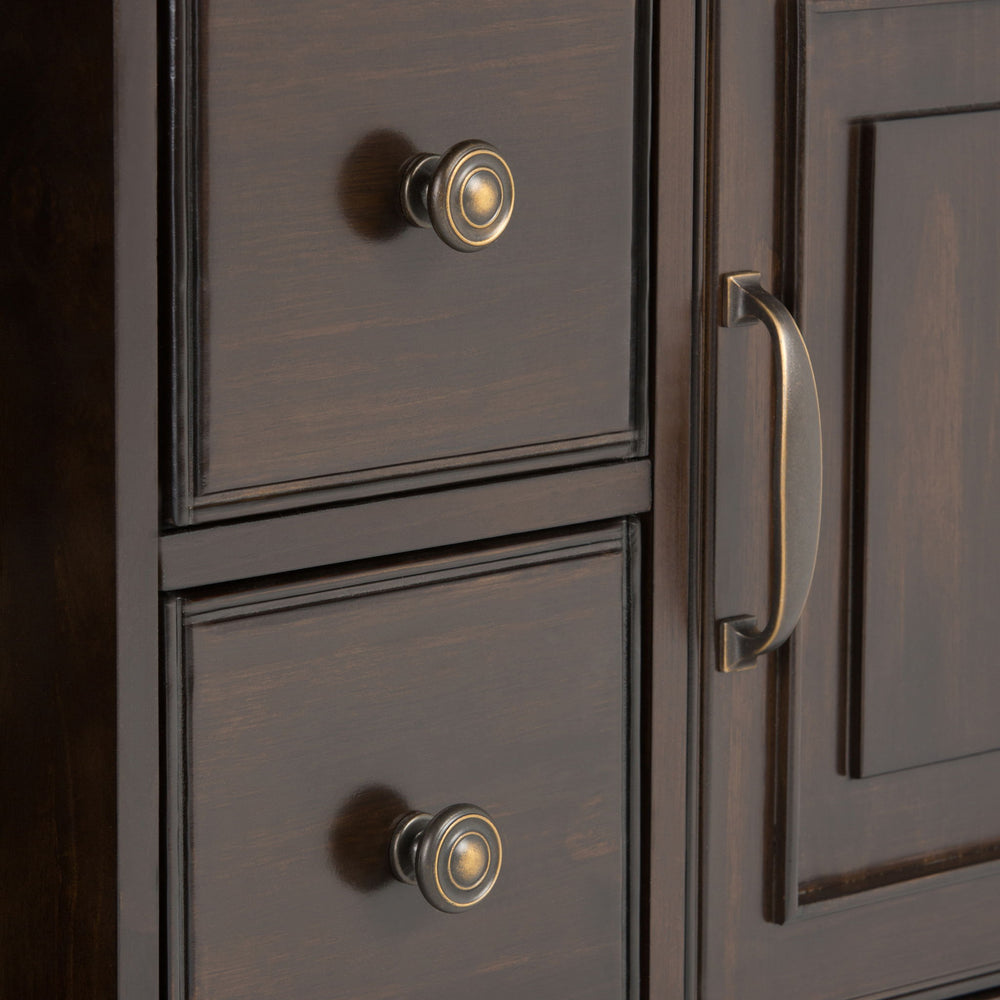 Traditional style Includes vintage raised panel doors and drawers, notched legs, Bronze decorative hardware and metal drawer glides