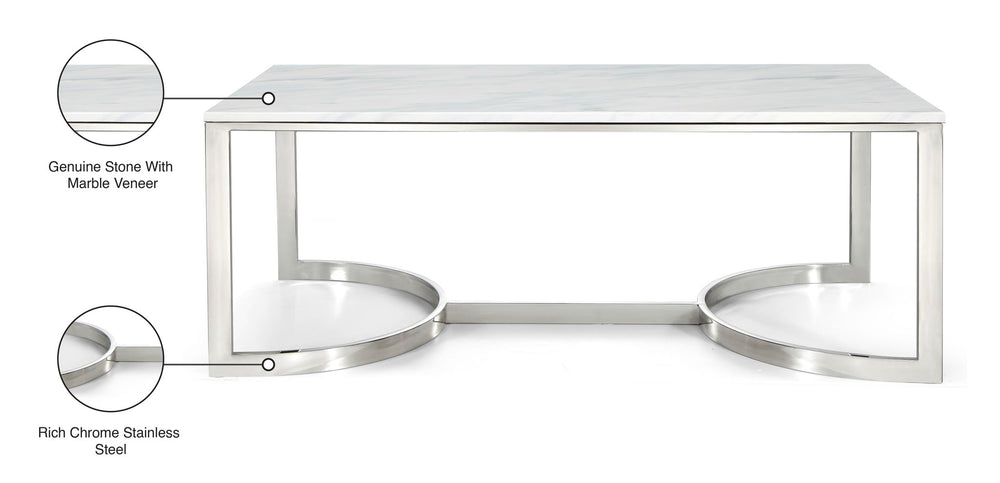 Lend your living room or den a modern slant with the Copley coffee table from Meridian Furniture. This coffee table features geometric bases, and a sleek chrome finish that gives your space a bold, up-to-the-minute look. Each table has a solid stone top for durability and style.
