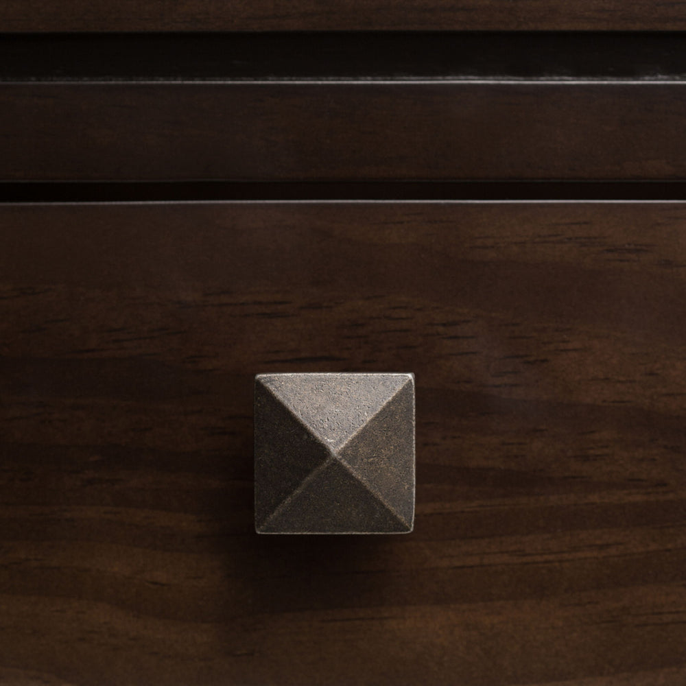 Contemporary design includes floating square edged top, square knobs with peaked top and square tapered legs.