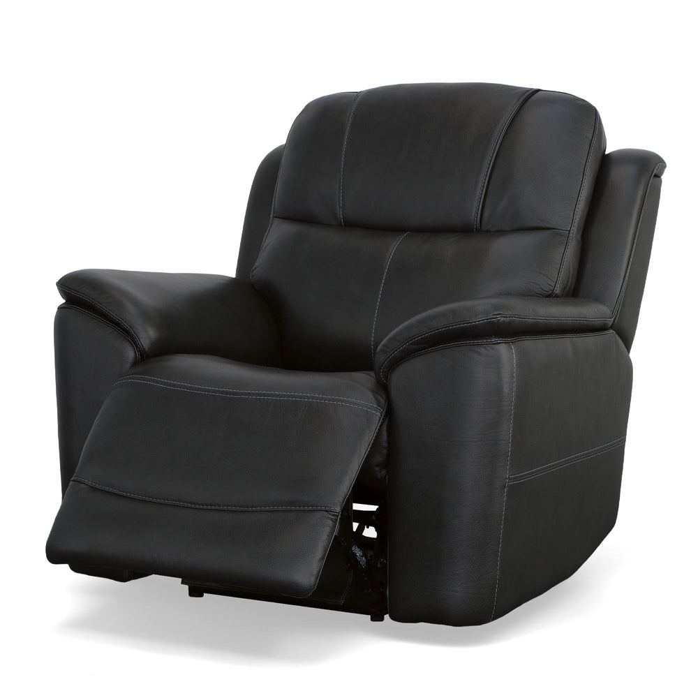Superior ergonomics combine with the plush comfort of the Crew leather power recliner. Featuring triple power functionality that allows for independent adjustment of the headrest, lumbar support and recline, this recliner also features Zero Gravity which reduces pressure and tension on the body. Enjoy reliable comfort all day, every day, with pad-over armrests, a waterfall chaise footrest, a thin layered headrest, and divided back cushion. Built-in USB ports conveniently keep mobile devices charged and ready to stream your favorite shows. With Flexsteel's patented Blue Steel Spring™ at the heart of the seat, and high-quality light tan leather, the Crew power recliner brings exceptional beauty and durability to your home.