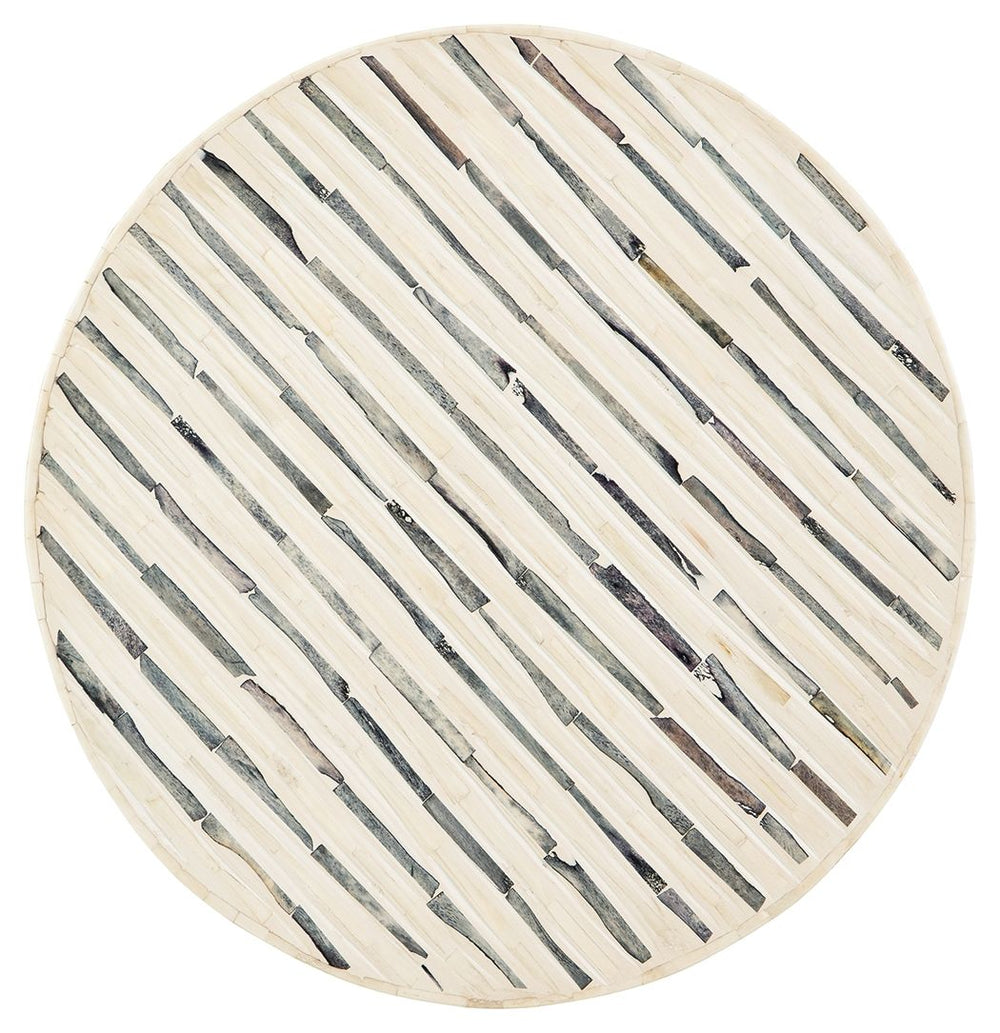Understatedly cool in its construction, this accent table adds a subtle sense of edginess to your modern decor. Its bone inlay in cream and black creates visual intrigue on the top, balanced out by the sleekly styled black base.