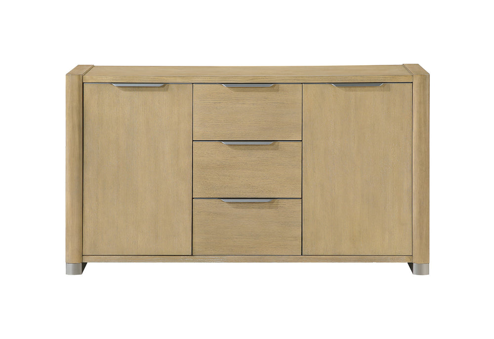 Complete your dining room with the D1248 Buffet, offering a perfect balance of style and storage. Featuring three spacious drawers and two cabinet doors, this buffet keeps your dining essentials organized and within reach. The natural wood veneer finish ties the room together, while its clean silhouette enhances the overall modern aesthetic.