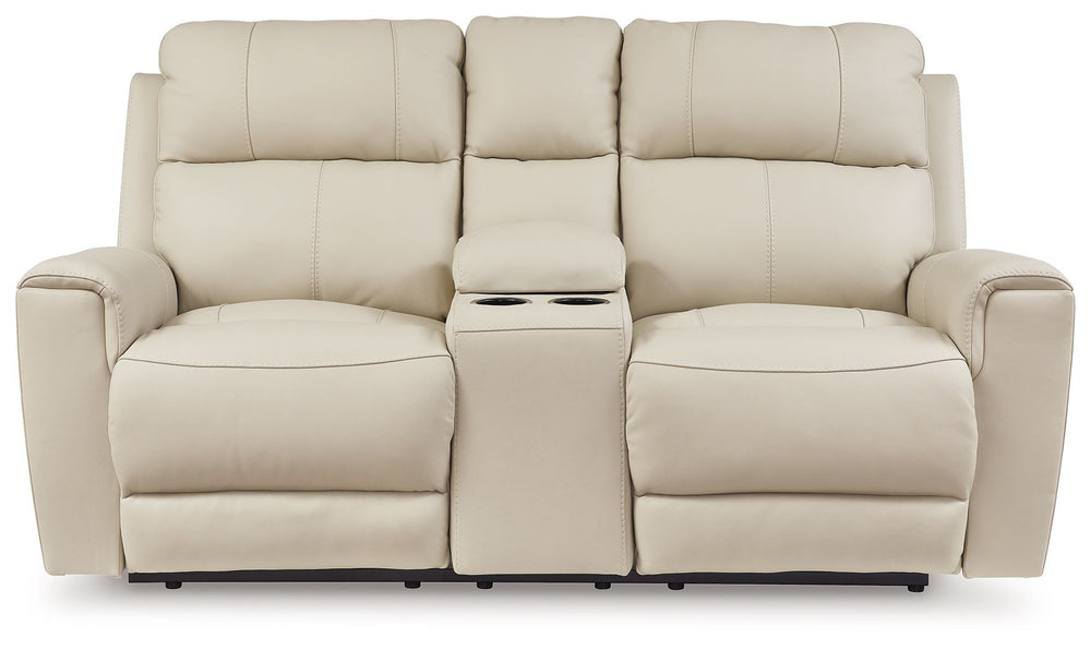 Focus on function. This practical power reclining loveseat with console balances contemporary character and irresistible comfort. Its affordable, expertly matched leather and faux leather upholstery keeps your style up to speed without breaking the bank. Reclining at the touch of a button, the loveseat plays well in relaxed, luxe seating areas made for quality time.