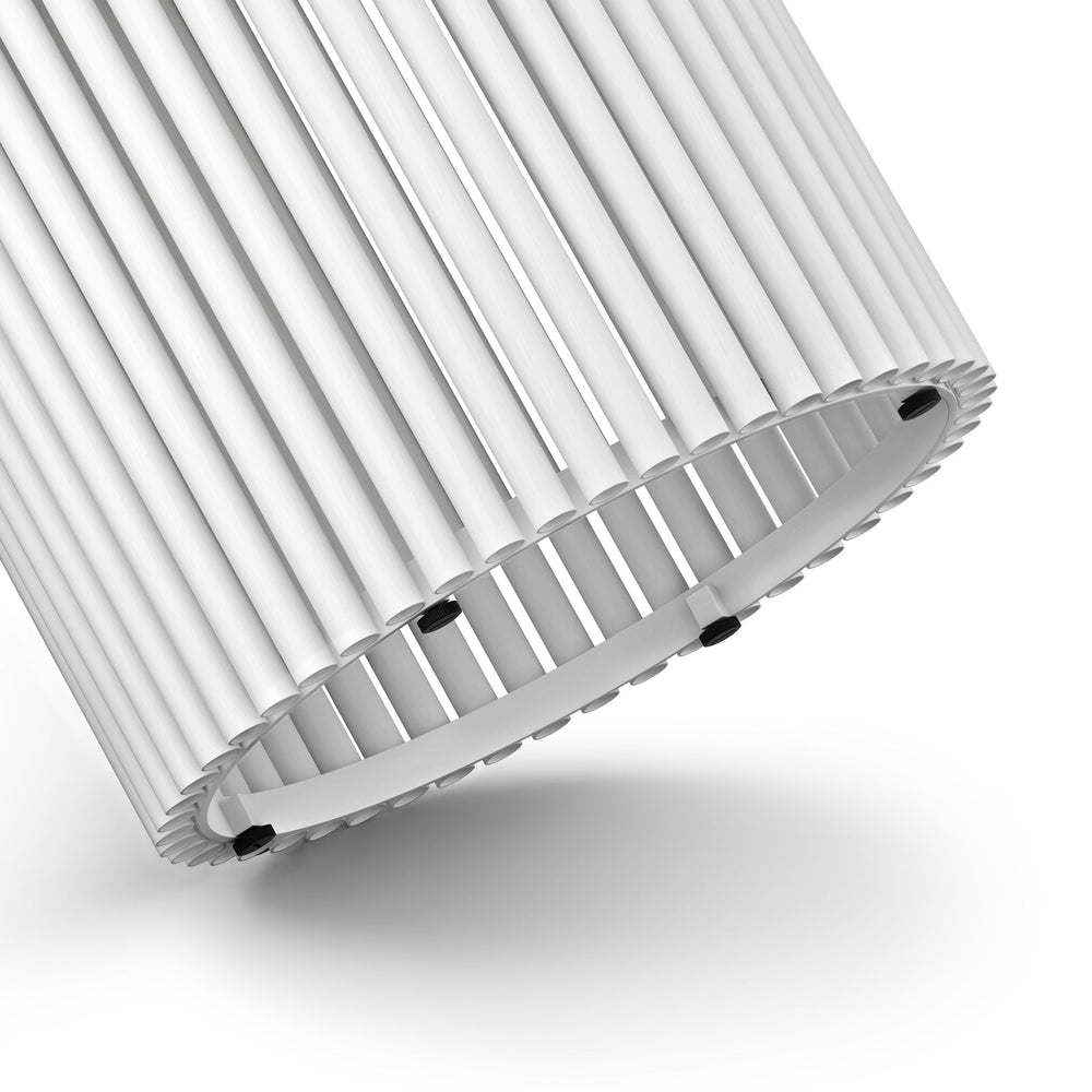 Features solid wood table top and tall cylinder shape with unique pipe design base
