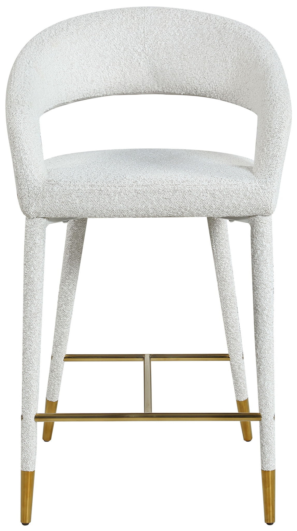 Settle in for a meal with friends seated in this Destiny boucle fabric stool. Soft cream fabric upholstery makes this stool a sleek and inviting option for pairing with your favorite counter table. The rounded back adds comfort to mealtime and lends the stool a chic, eye-grabbing touch, while tapered legs topped with gold tips give the stool an elegant finish.