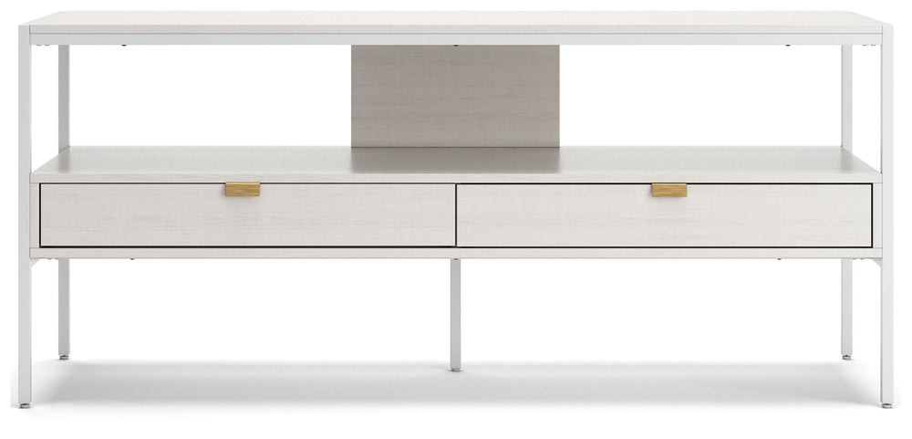 Bring your vision of a modern living room to life with this sleekly designed TV stand. Its linear construction and white finish keep things minimal. An open shelf and two drawers allow you to store in simply streamlined style, rounding out this versatile, striking piece.