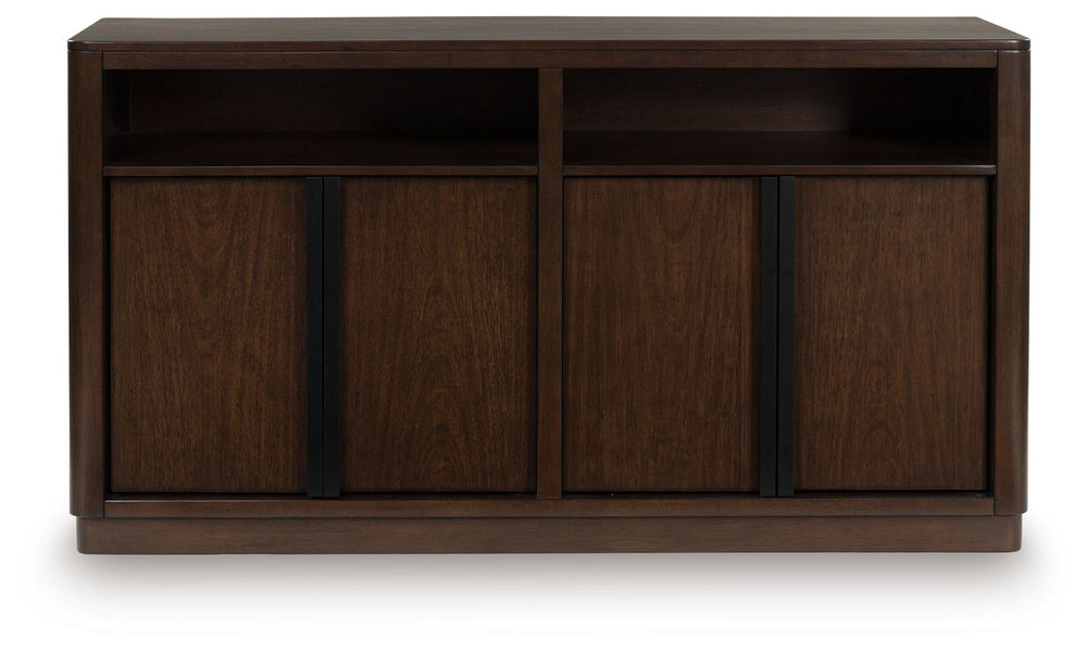 Casual contemporary styling with a decidedly modern vibe. This dining server dresses your dining spot in on-trend elegance with its rich warm brown finish. Full-length metal pulls in a matte black tone add a subtly cool touch to spacious storage cabinets. And thanks to its versatile functionality, this four-door piece effortlessly works as a sideboard, entryway table or TV stand. Now there’s a simply stunning show of great taste—wherever you place it.