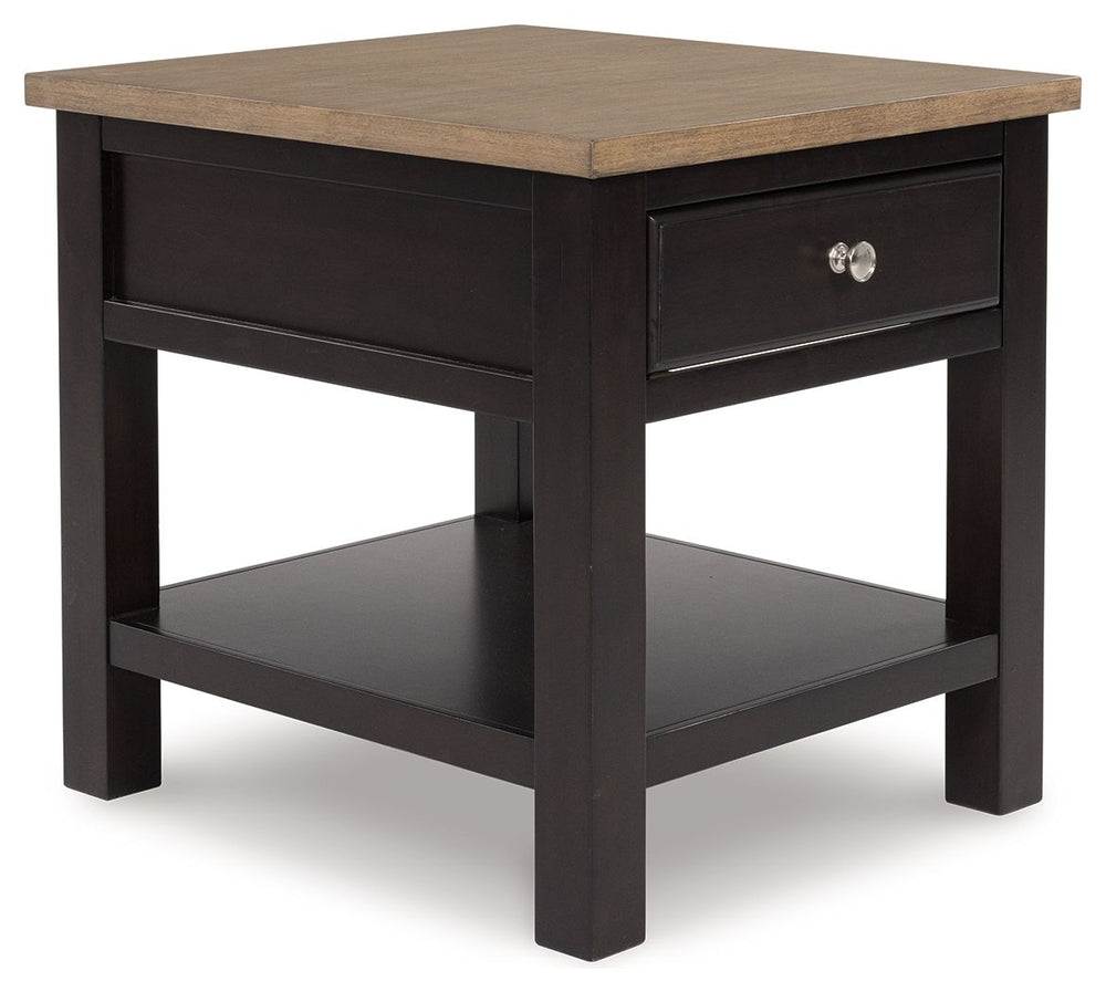 When you’re styling your living room, convenience is key. With this end table, casual flair meets can’t-miss function. Tired of tracking down lost remotes? A handy storage drawer keeps your entertainment essentials close. This fashionably functional piece pairs a dark chocolate brown with a light wood tone, complementing a variety of color palettes.