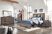 When merged in just the right way, rustic and industrial styles can make one happy marriage. Case in point: this bedroom group. A refined take on barn board beauty, its complex, replicated wood grain showcases hints of burnt orange and teal tones for a sense of weatherworn authenticity. Three open cubbies lined with a dimming LED light strip keep bedtime reads top of mind. Underneath the bed: four smooth-gliding drawers and four open cubbies that accommodate casually cool storage bins. Burnt orange and teal colors accent a brown rustic finish in a replicated woodgrain with authentic touch. Large scaled dark colored handles. Cases feature a framed front and pilasters.