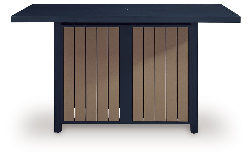 Easy-breezy beauty, made to withstand the elements. This outdoor bar table with fire pit makes a serene statement on your deck or patio with its soothing shade of blue and contrasting wood-look cabinets. An integrated fire pit in the top adds a perfectly cozy vibe when in use. And with durable materials providing added longevity, this fire pit table is a smartly-stylish addition to your outdoor oasis.