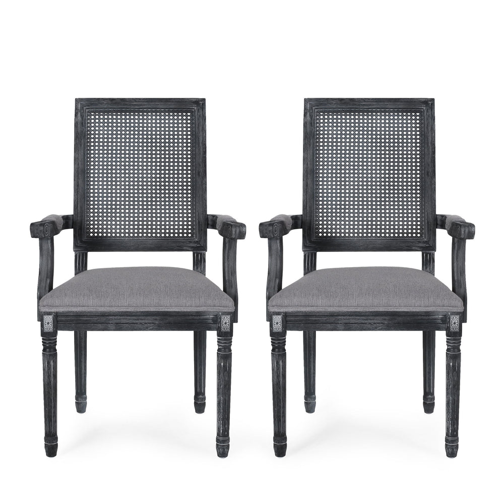 Vintage French Country Dining Chair Set With Cane Backrest And Upholstered Seat - Gray Wood 23.75"W x 23.75"D x 39.75"H - 20.5 lb