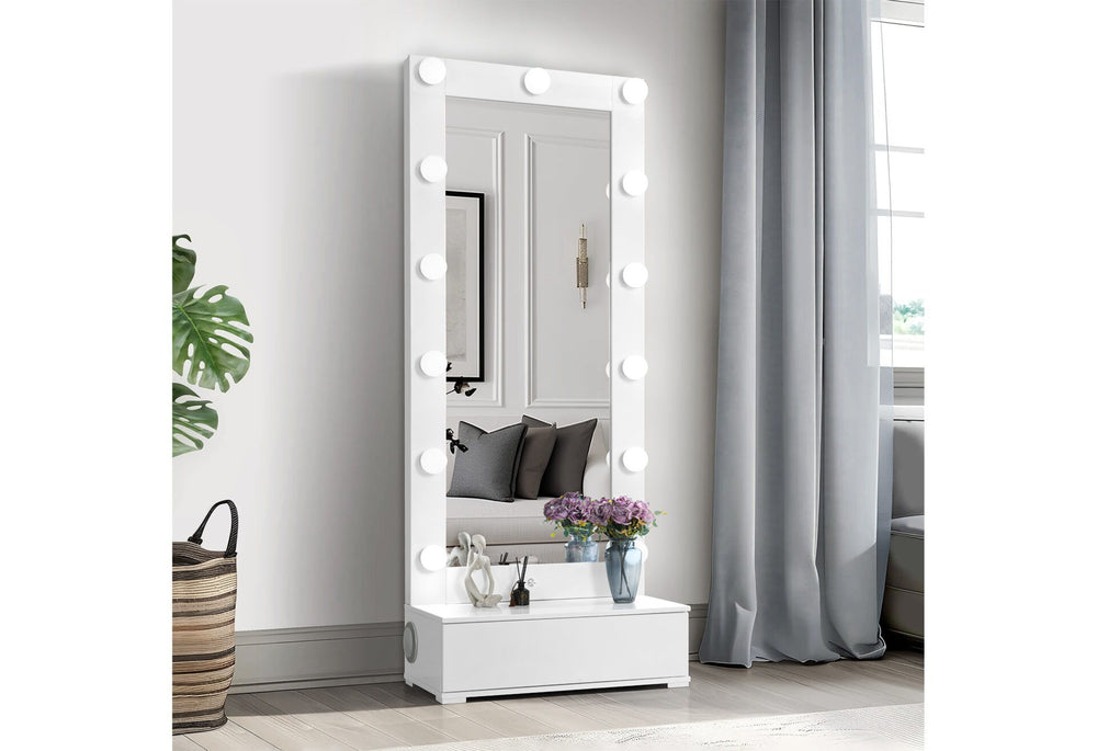 The Ella White Narrow Mirror with Drawer by Global Furniture is a sleek and functional addition to any modern bedroom or dressing space. This floor-length LED mirror offers full-body visibility with elegant, built-in lighting to brighten your look and your room. Finished in glossy white lacquer, it features a discreet storage drawer for accessories or daily essentials, and a built-in speaker to enhance your routine with music or audio. With its tall, space-saving design and modern tech features, the Ella Narrow Mirror is the perfect blend of style, function, and innovation.