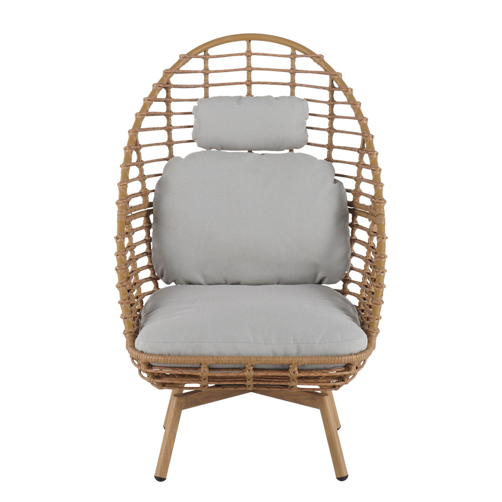 Towering Comfort: The lounge chair features a high-back design that supports and cradles the spine, made with breathable light-brown rattan woven over a swivel-base iron frame. It is ideal for activities like sunbathing, reading, or stargazing.