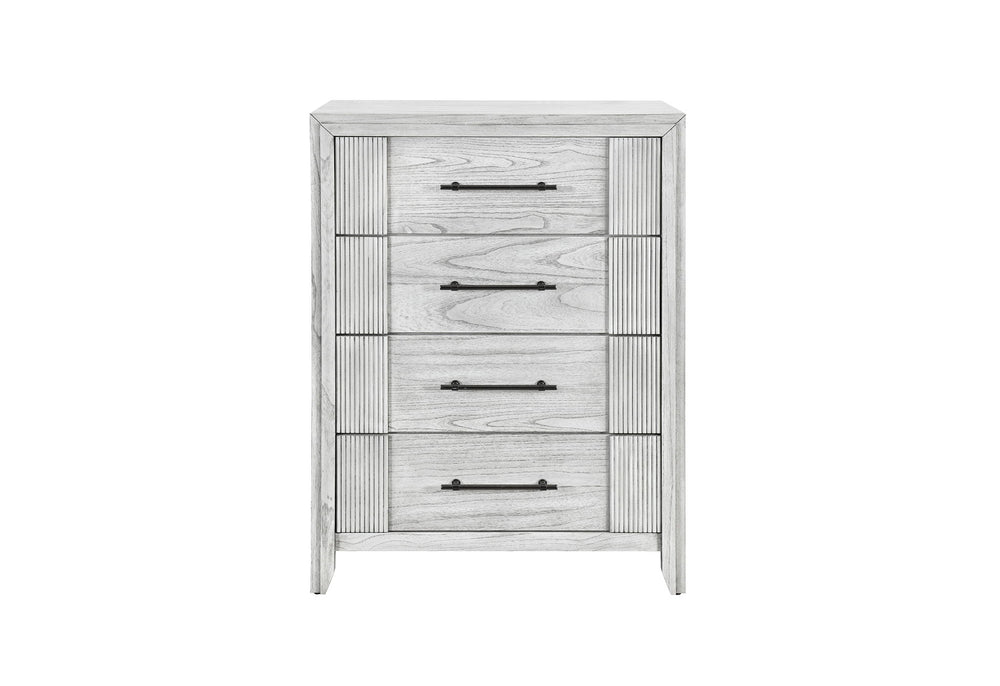 Maximize your storage without compromising on style with the Elsie Chest. Featuring 4 spacious drawers with fluted textures and dark handles, this piece combines modern design with practicality. The grey wash veneer finish ties the look together, making it a versatile addition to your bedroom suite.