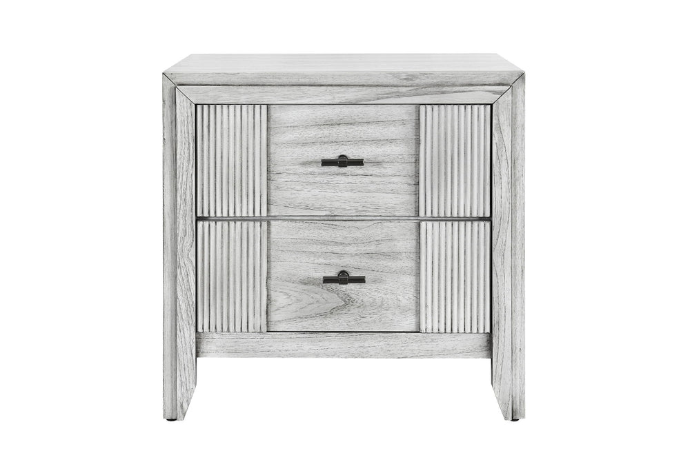 The Elsie Nightstand is the perfect bedside companion, featuring two drawers accented with fluted textures and sleek dark hardware. Finished in a grey wash veneer, it offers both storage and style. Its compact design provides easy access to your nighttime essentials while maintaining a high-end, polished appearance.