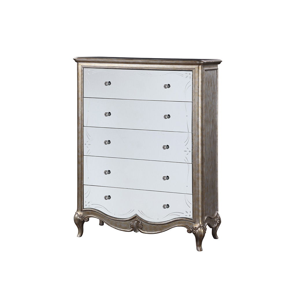 Elegant Design: This Antique Champagne chest combines luxury and sophistication, featuring five beautifully designed drawers that merge style and practicality.