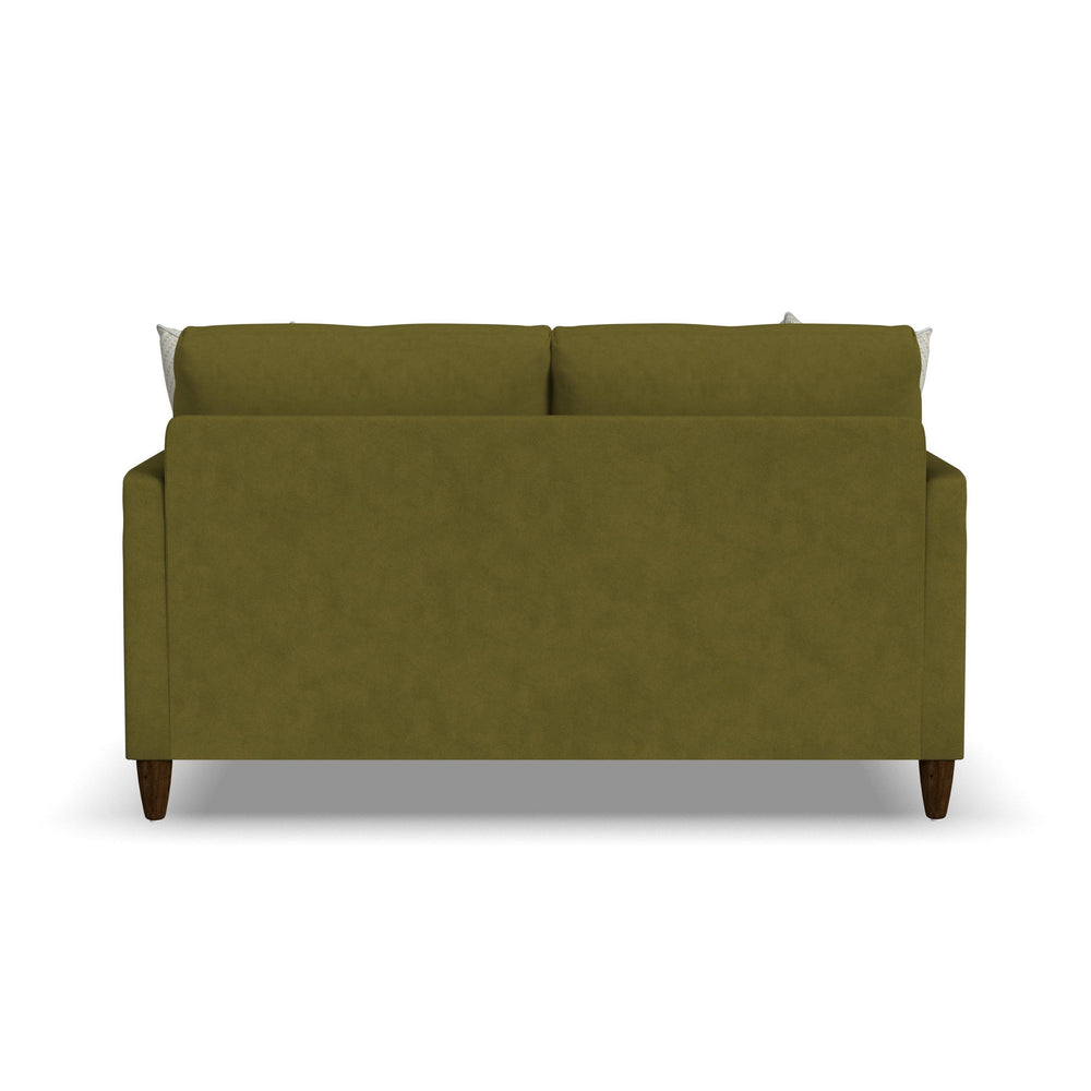 Clean lines and a cantilevered front make the Fern loveseat a welcome addition to any home. With generous seating space from arm to arm, Fern provides plenty of roomy comfort for two people to lounge and relax together. Round tapered legs positioned directly under the narrow track arms offer a distinctively modern architectural feel to spaces. Loose back cushions with a casual pleat design and the included knife-edge accent pillows complete the on-trend look of Fern.