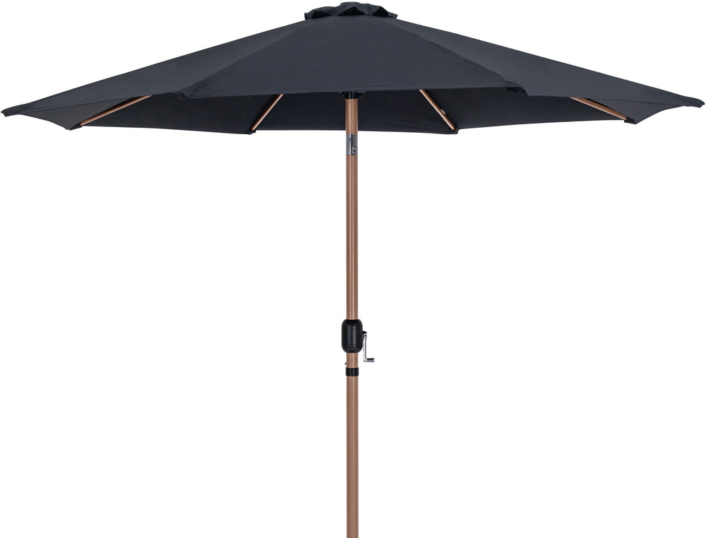 Bask in the shade wherever it's needed when you bring home this Fiji fabric and teak aluminum patio umbrella with matte black base set. This ingenious umbrella and base can be used as a standalone umbrella on a deck or patio - or add it to your choice of table for a sturdy solution for hiding from the sun's rays. The aluminum pole weathers the elements like a champ, and the umbrella is crafted from water-resistant fabric for a beautiful, lasting look.