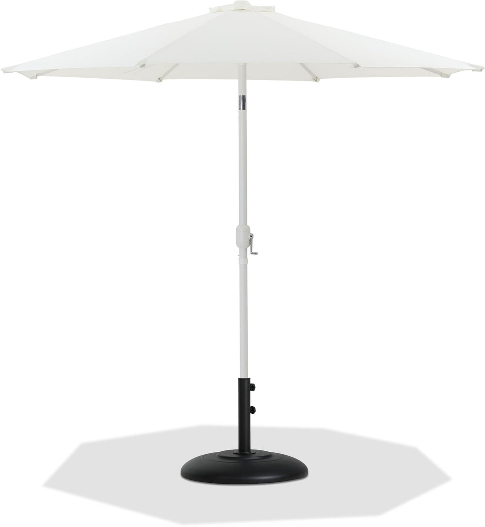 Bask in the shade wherever it's needed when you bring home this Fiji fabric and matte white aluminum patio umbrella with matte black base set. This ingenious umbrella and base can be used as a standalone umbrella on a deck or patio - or add it to your choice of table for a sturdy solution for hiding from the sun's rays. The aluminum pole weathers the elements like a champ, and the umbrella is crafted from water-resistant fabric for a beautiful, lasting look.