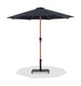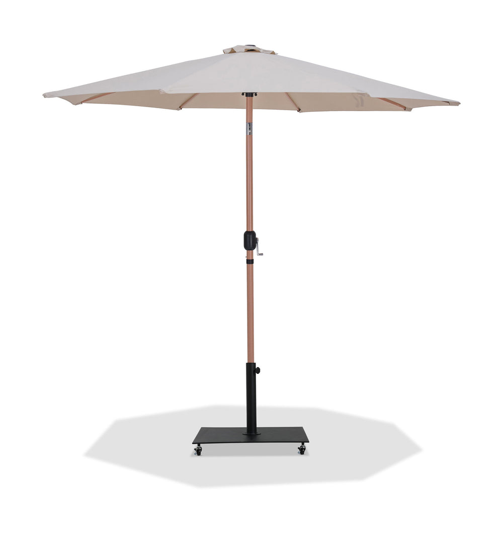 Bask in the shade wherever it's needed when you bring home this Fiji fabric and teak aluminum patio umbrella with matte black base set. This ingenious umbrella and base can be used as a standalone umbrella on a deck or patio - or add it to your choice of table for a sturdy solution for hiding from the sun's rays. The aluminum pole weathers the elements like a champ, and the umbrella is crafted from water-resistant fabric for a beautiful, lasting look. Casters on the base make for easy portability.