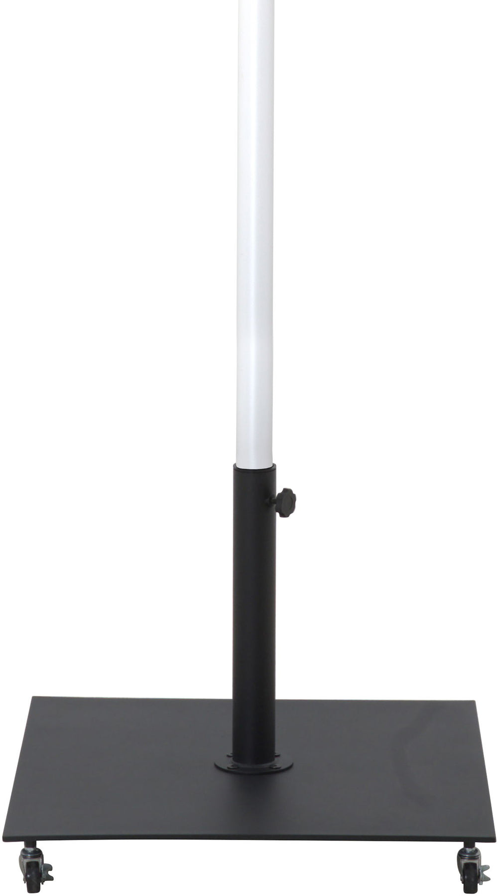 Bask in the shade wherever it's needed when you bring home this Fiji fabric and matte white aluminum patio umbrella with matte black base set. This ingenious umbrella and base can be used as a standalone umbrella on a deck or patio - or add it to your choice of table for a sturdy solution for hiding from the sun's rays. The aluminum pole weathers the elements like a champ, and the umbrella is crafted from water-resistant fabric for a beautiful, lasting look. Casters on the base make for easy portability.